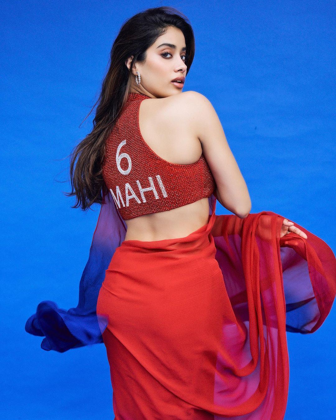 Her blouse has “Mahi 6” written on the back. Giving a hint that her new movie Mr and Mrs Mahi’s trailer has already dropped, the movie is going to hit the theatres on 31st May 2024.