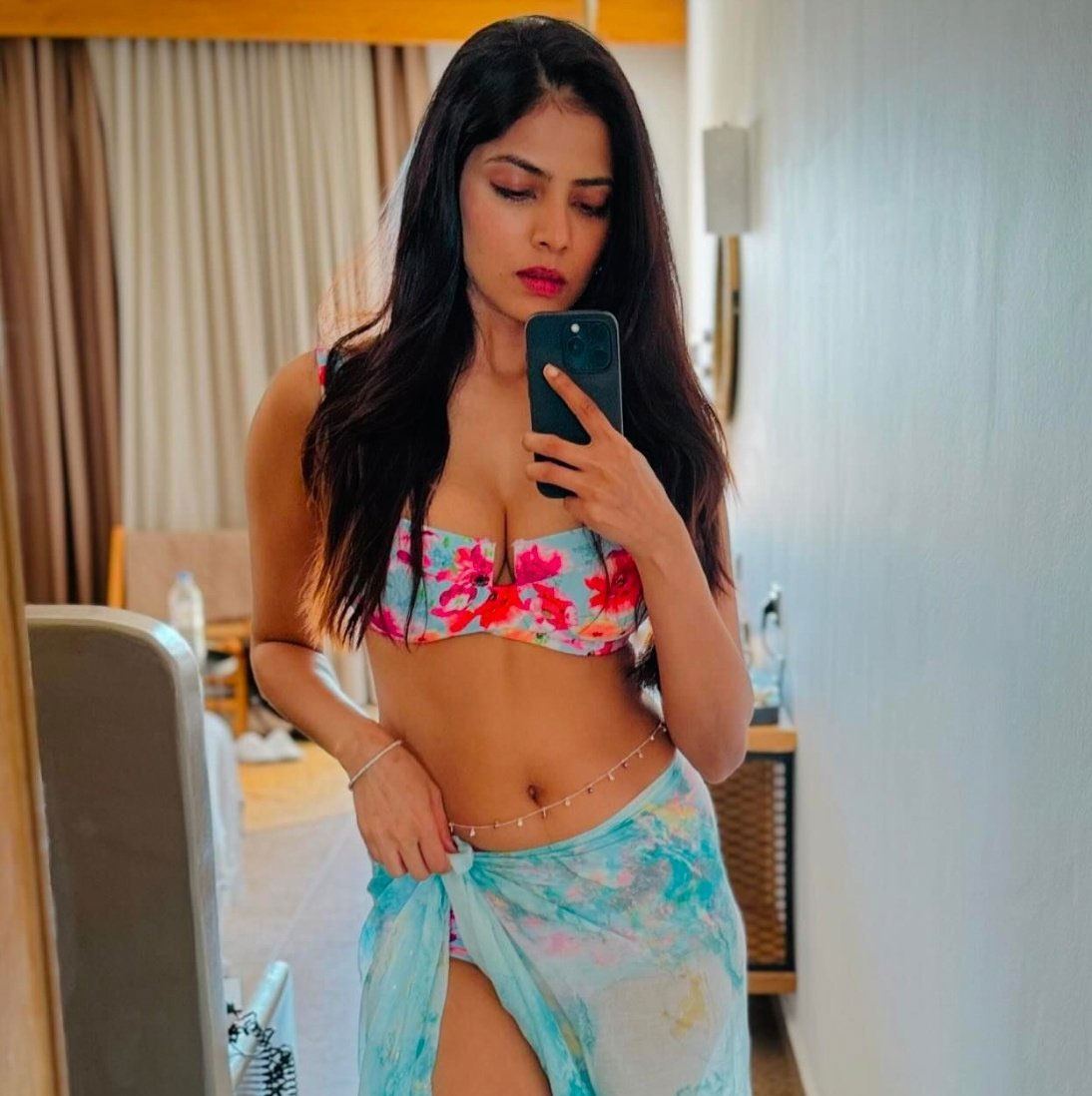 Malvika looks beach-ready in her recent look. Malavika’s floral bikini has captured the hearts of hundreds of thousands of people, who are now flooding her comment section. The actress’s dusky skin paired with the white bikini was the perfect combo. Gracing her absolutely drool worthy waist line was a waist chain. The chique factor skyrocketed with her aqua-hued sarong that covered her lower body, from which a leg was peeking out. The actress chose to let that Grecian air take hold of her hair as she was seen letting it flow.