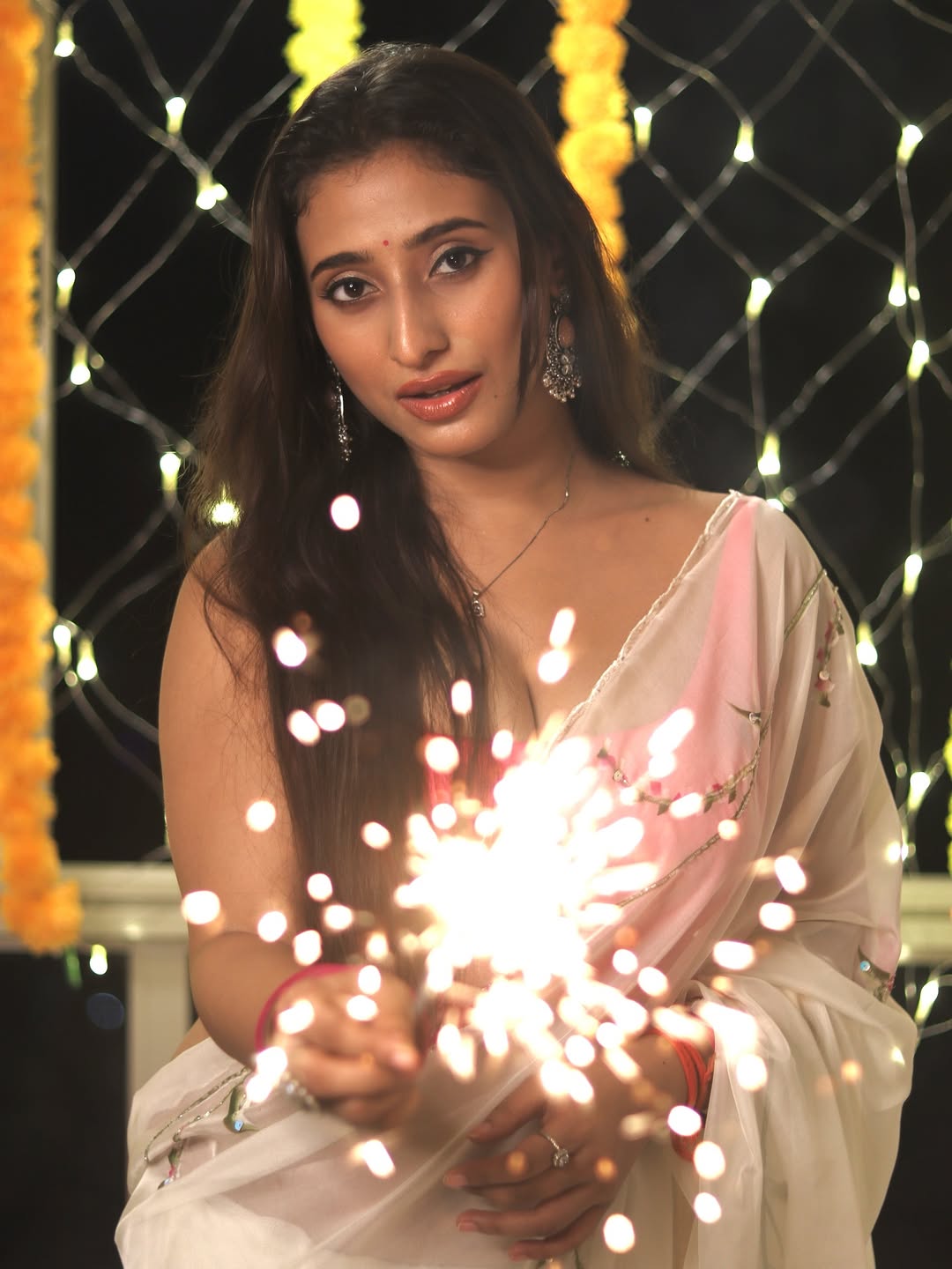 Kheyali Nath brings pure festive glow to life in her latest Diwali shoot, dressed in a soft white saree with a bold pink blouse that perfectly balances charm and confidence. Her effortless smile, graceful curves, and delicate jewellery highlight her natural elegance under warm festive lights. With sparklers in hand and diyas glowing around her, Kheyali radiates the essence of Indian celebration — vibrant, authentic, and full of heart. Her poise, confidence, and feminine energy make this photoshoot a perfect blend of simplicity and style, proving that festive fashion is all about confidence and grace.