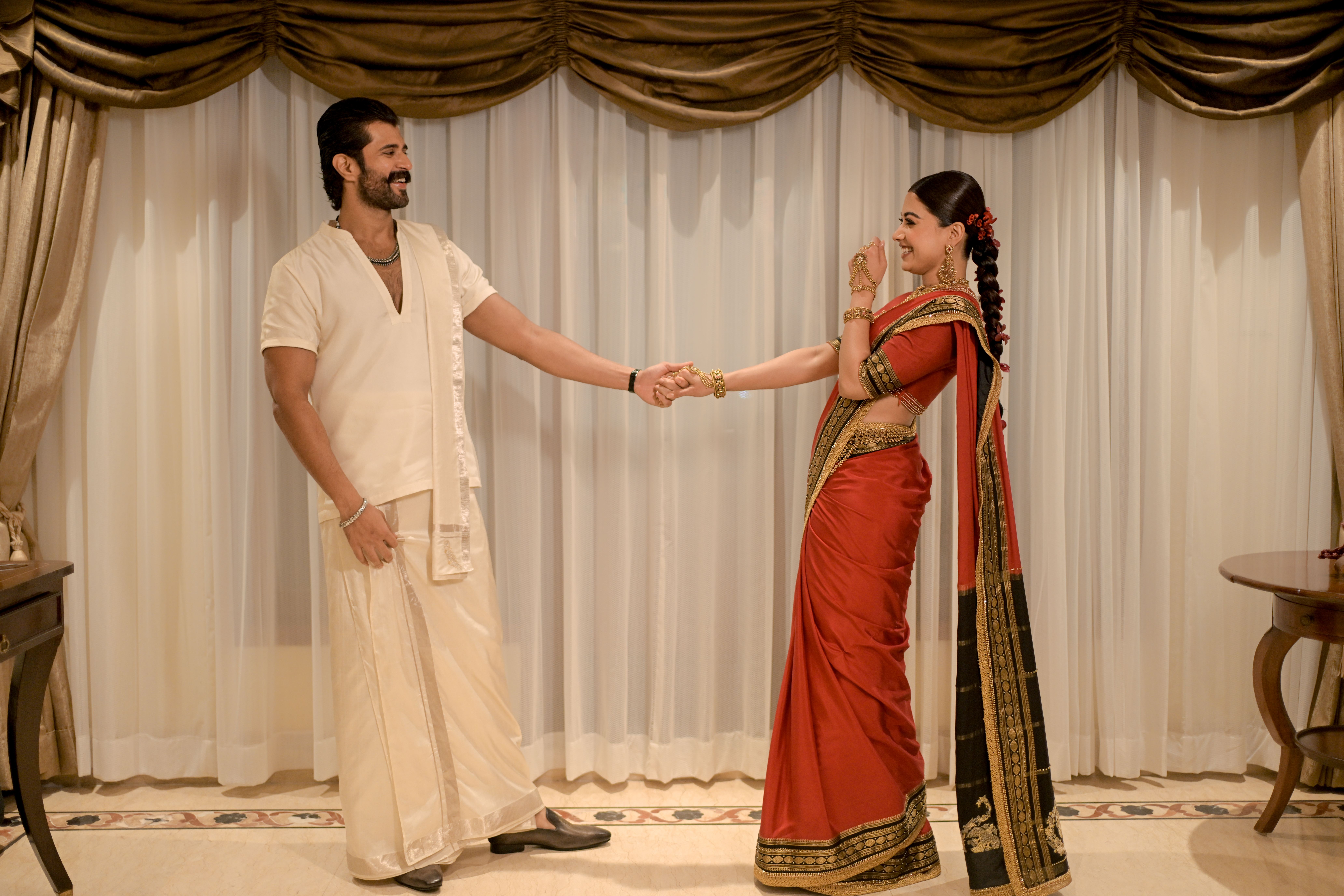 Vijay Deverakonda and Rashmika Mandanna turned the Virosh wedding reception into a full blown fashion spectacle. The duo served effortless power couple energy, blending heritage charm with modern star confidence. Vijay kept it sharp in a cream dhoti and open collar kurta, radiating relaxed royal vibes. Rashmika dazzled in a bold red silk saree with an ornate gold border, sculpted drape, and statement temple jewellery that framed her glow. From playful hand in hand moments to poised family portraits, their chemistry and body language spoke volumes. This was not just a reception appearance, it was a headline making style moment.
