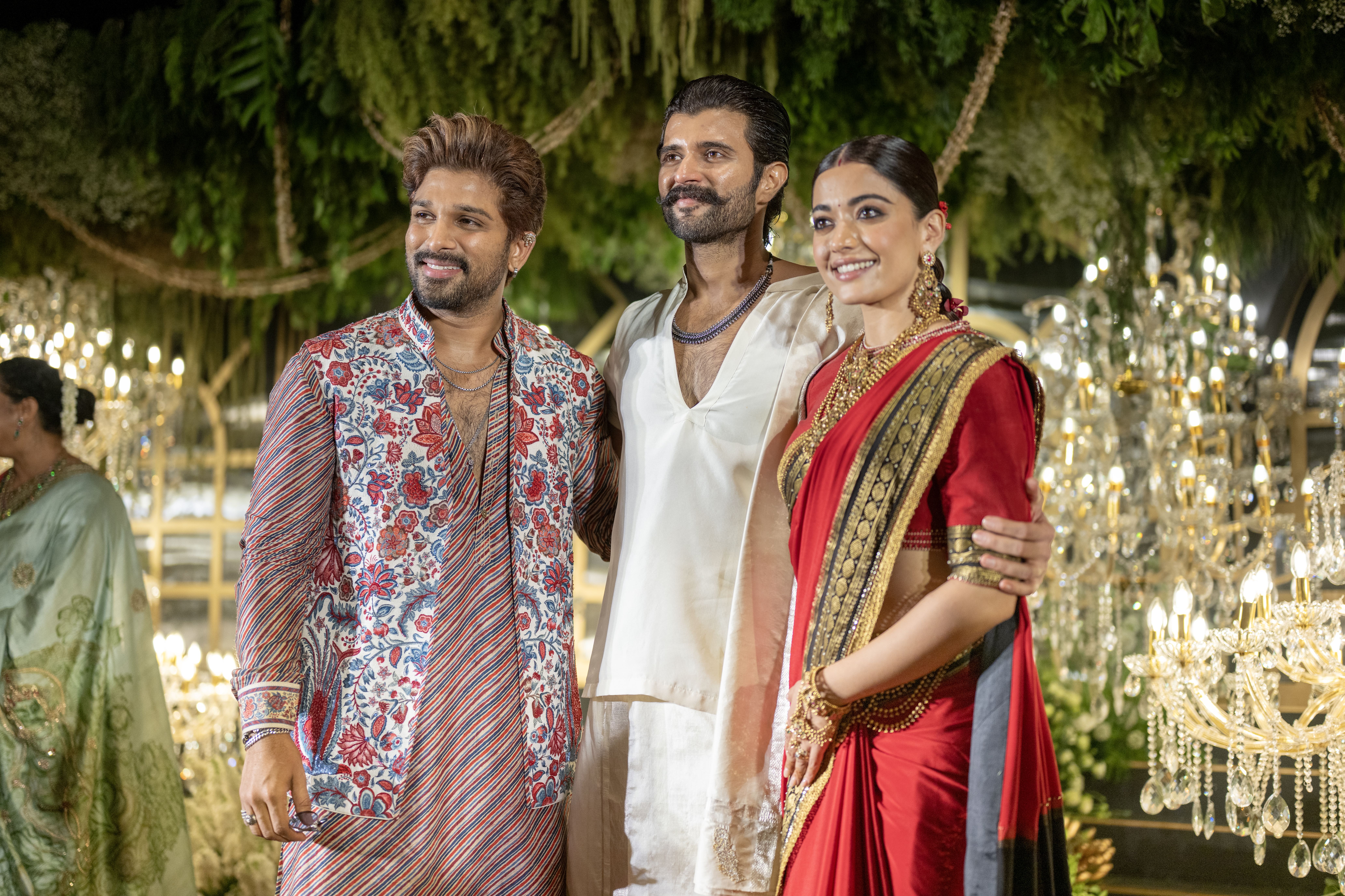 Vijay Deverakonda and Rashmika Mandanna turned the Virosh wedding reception into a full blown fashion spectacle. The duo served effortless power couple energy, blending heritage charm with modern star confidence. Vijay kept it sharp in a cream dhoti and open collar kurta, radiating relaxed royal vibes. Rashmika dazzled in a bold red silk saree with an ornate gold border, sculpted drape, and statement temple jewellery that framed her glow. From playful hand in hand moments to poised family portraits, their chemistry and body language spoke volumes. This was not just a reception appearance, it was a headline making style moment.