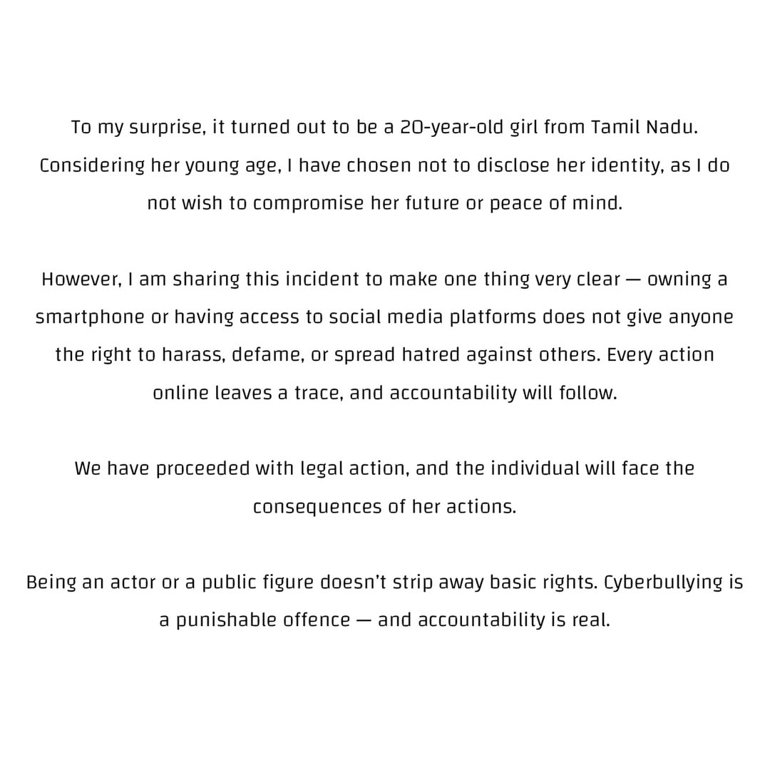 We have proceeded with legal action, and the individual will face the consequences of her actions. Being an actor or a public figure does not strip away basic rights. Cyberbullying is a punishable offence, and accountability is real.”
