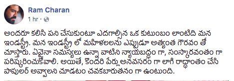 But, there are a few who are trying to gain popularity by revealing some names. This is what Ram Charan said in a Facebook post sharing video bite of Pawan Kalyan. He further added that it is cheap to gain popularity in this manner. So, it’s implicit that Ram Charan has responded to Sri Reddy for dragging Pawan Kalyan’s name into the mire.