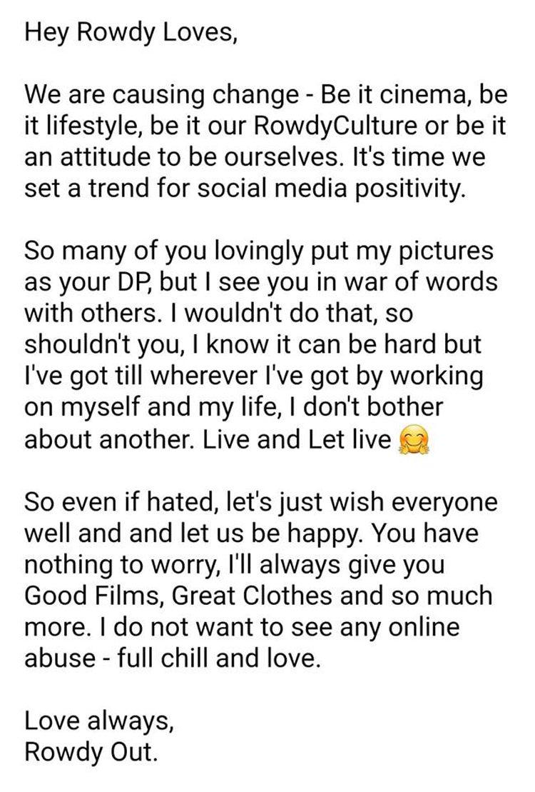 He wrote an open letter to his loving fans who put up his picture as the DP and use abusive language. He reminded that he and his rowdies are part of the change and no matter what they receive from others, they are going to spread only love. Vijay D explained his motto quite clearly, ‘Live and Let Live’.