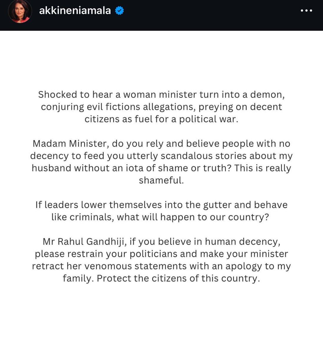 Amala didn’t hold back, showing no diplomacy. In her letter, she called Konda Surekha a “demon” and questioned if the minister had “an iota of shame.”
