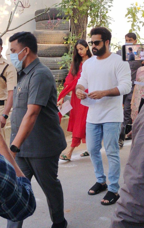 NTR cast his vote at Obul Reddy Public School, Jubilee Hills, accompanied by his wife Pranathi and mother Shalini.